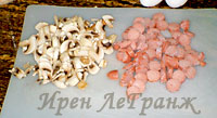 Сначала порежем сосиски и грибы, в произвольной форме. Так как я люблю грибы, жаренные с луком, обжарю немного лук, чтобы придать моему омлету вкус.