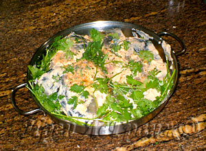 Затем перехожу к соусу. Смешиваю сметану с горчицей, добавляю пасту карри, измельченный чеснок, соль и перец и обмазываю рыбу со всех сторон. Посыпаю сверху зеленью и закрываю сковороду крышкой.