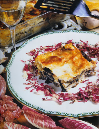 Проворите 1 минуту листики лазаньи в подсоленной кипящей воде. Слейте воду и выложите слой пасты в подготовленной форме для выпечки. Посыпать смесью из радиккио, пятой частью бешамель, и 2 столовыми ложками Пармезана. Продолжайте следующие слои, пока не израсходуете все ингредиенты. Самым верхним слоем должен быть Пармезан.