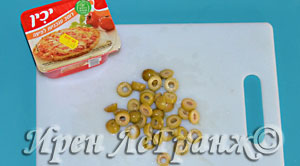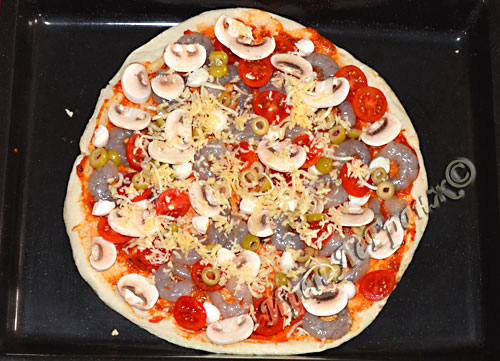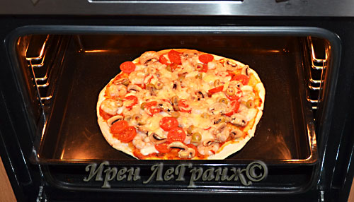 Готовую пиццу разрезаем на порционные кусочки и подаем к столу в теплом виде.